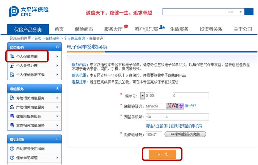 登錄太平洋壽險官方網站(http://www.ecpic.com.cn/),輸入“保單號”、“驗證碼”、“預留手機號”和“短信驗證碼”即可簽收保單回執。